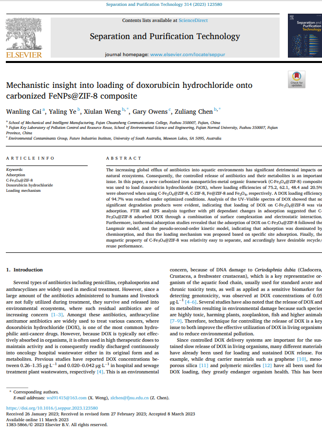 近日,福建船政交通職業(yè)學(xué)院機械與智能制造學(xué)院蔡婉玲老師在期刊《Colloids and Surfaces B: Biointerfaces》(JCR Q1,IF=5.999)和期刊《Separation and Purification Technology》(JCR Q1,IF=9.136)分別發(fā)表了題為“MagneticFe3O4@ZIF-8 nanoparticles as a drug release vehicle: pH-sensitive release of norfloxacin and its antibacterial activity”和題為“Mechanistic insight into loading of doxorubicin hydrochloride onto carbonized FeNPs@ZIF-8 composite”的研究論文。