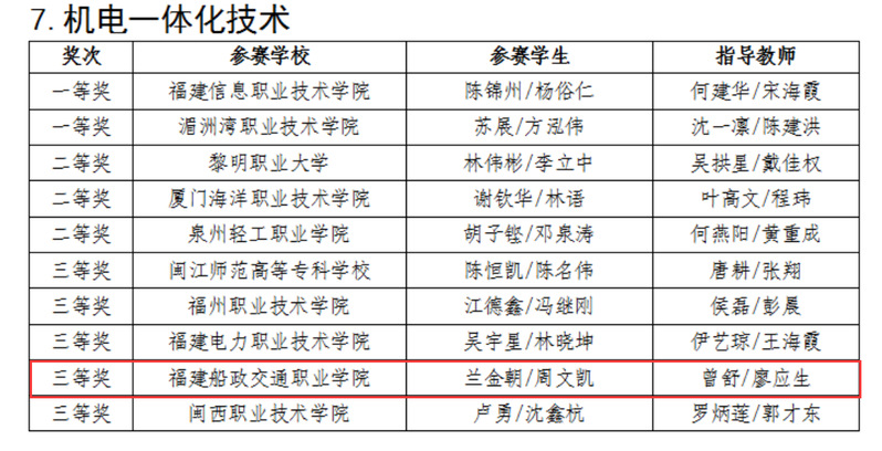 2023年12月23日-12月24日,福建省職業(yè)技能大賽“機(jī)電一體化”賽項(xiàng)在湄洲灣職業(yè)技術(shù)學(xué)院舉辦,來自全省的16支隊(duì)伍參賽。我院曾舒、廖應(yīng)生兩位老師指導(dǎo)的蘭金朝、周文凱同學(xué)獲得三等獎(jiǎng)。