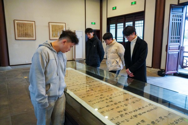 行至慶云樓,慶云樓在過去起到藏書的作用。現(xiàn)在此處收集了不少朱熹和書畫名家墨寶的拓片和仿品,瞻仰著前人留下來的墨寶,這些墨寶的每一個(gè)字都凝聚著作者的心血和智慧,這些墨寶不僅僅是一幅作品,更是一種傳承與交流,讓實(shí)踐隊(duì)隊(duì)員們深刻感受到傳統(tǒng)文化的魅力。