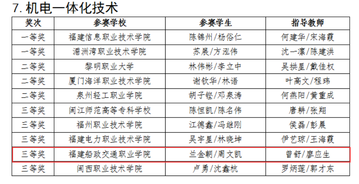2023年12月23日-12月24日,福建省職業(yè)技能大賽“機(jī)電一體化”賽項在湄洲灣職業(yè)技術(shù)學(xué)院舉辦,來自全省的16支隊伍參賽。支部黨員廖應(yīng)生老師和另一位指導(dǎo)老師曾舒老師指導(dǎo)的蘭金朝、周文凱同學(xué)獲得三等獎。