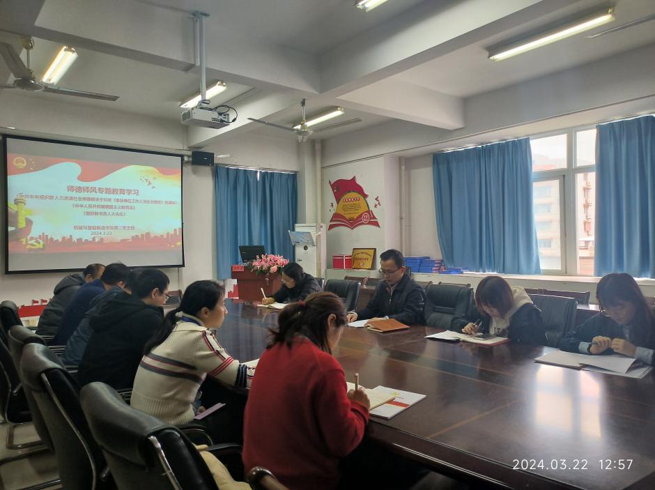 為加強(qiáng)師德師風(fēng)建設(shè)工作,嚴(yán)肅學(xué)院教師隊伍工作紀(jì)律,規(guī)范教師行為,教育和引導(dǎo)教職工敬畏法規(guī)、踐行法規(guī),依法依紀(jì)辦事,3月22日,機(jī)械與智能制造學(xué)院第二黨支部全體黨員專題學(xué)習(xí)了《事業(yè)單位工作人員處分規(guī)定》、《中華人民共和國愛國主義教育法》和中國教育部中國教育報關(guān)于《做好教書育人大先生》的報道,會議由第二黨支部書記楊開懷主持。