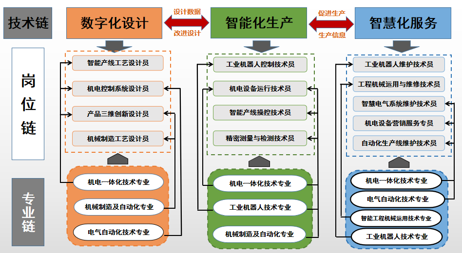 全面對接“中國制造2025”、“數(shù)控一代”、“智能制造”等國家、福建省重大戰(zhàn)略,培養(yǎng)交通機(jī)械制造的高端復(fù)合型人才、輸出技術(shù)服務(wù)、支撐中小微制造業(yè)企業(yè)轉(zhuǎn)型升級。專業(yè)群聚焦先進(jìn)制造業(yè)發(fā)展對福建省機(jī)電產(chǎn)業(yè)高端的人才需求,圍繞數(shù)字化設(shè)計→智能化生產(chǎn)→智慧化服務(wù)技術(shù)鏈,覆蓋了工程機(jī)械與制造領(lǐng)域的數(shù)字化設(shè)計、智能制造、工業(yè)機(jī)器人、智能制造控制技術(shù)等關(guān)鍵技術(shù)領(lǐng)域技能型人才培養(yǎng),實(shí)現(xiàn)了工程機(jī)械等高端機(jī)電工業(yè)產(chǎn)品從“前端設(shè)計、中端制造、末端服務(wù)”的生命全周期管理,同時末端服務(wù)信息可以改進(jìn)設(shè)計、促進(jìn)生產(chǎn)。專業(yè)鏈與崗位鏈、技術(shù)鏈高度契合,如圖1所示。