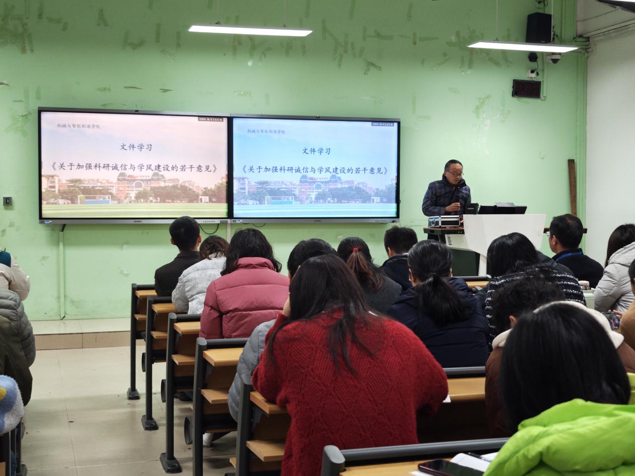 為進一步加強科研誠信建設,營造風清氣正的學術(shù)環(huán)境,培養(yǎng)良好的學風,機械與智能制造學院于2025年2月19日下午組織全體教職工開展關(guān)于加強科研誠信與學風建設的專題文件學習活動。此次活動旨在深入貫徹落實國家關(guān)于科研誠信和學風建設的重要指示精神,推動學院科研與教育工作高質(zhì)量發(fā)展。學習會議由楊開懷院長主持,陳貴清副院長領(lǐng)學。