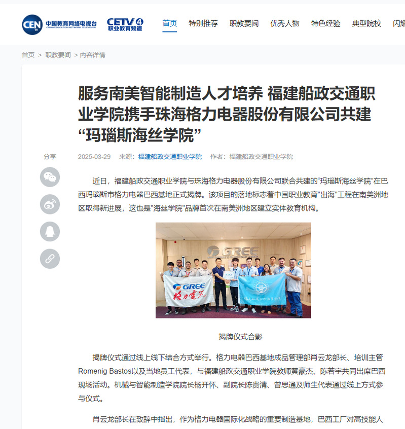 近日,福建船政交通職業(yè)學院與珠海格力電器股份有限公司聯(lián)合共建的“瑪瑙斯海絲學院”在巴西瑪瑙斯市格力電器巴西基地正式揭牌。該項目的落地標志著中國職業(yè)教育"出海"工程在南美洲地區(qū)取得新進展,這也是"海絲學院"品牌首次在南美洲地區(qū)建立實體教育機構。