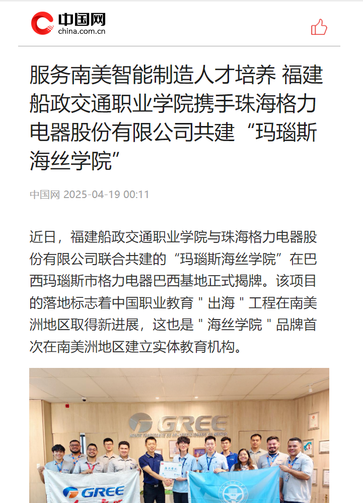 近日,福建船政交通職業(yè)學(xué)院與珠海格力電器股份有限公司聯(lián)合共建的“瑪瑙斯海絲學(xué)院”在巴西瑪瑙斯市格力電器巴西基地正式揭牌。該項目的落地標志著中國職業(yè)教育"出海"工程在南美洲地區(qū)取得新進展,這也是"海絲學(xué)院"品牌首次在南美洲地區(qū)建立實體教育機構(gòu)。