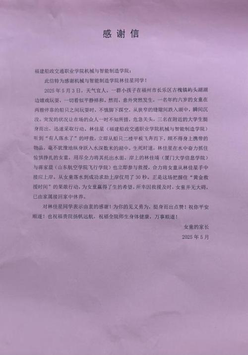 5月3日,福州市長樂區(qū)古槐鎮(zhèn)嶼頭湖游船上一兒童腳下踩空,不慎落水。機械與智能制造學院2023級智能工程機械運用技術(shù)2班林佳星同學正在此游船上看風景,聽到呼救聲后,他立即挺身而出,毫不猶豫跳入湖中將落水的女童成功救起。