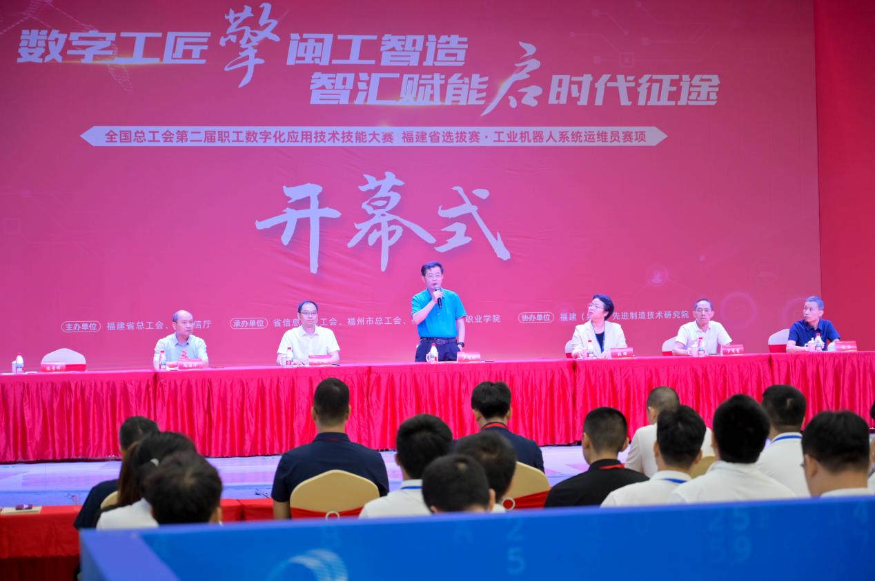 2025 年 8 月 22 日,全國總工會(huì)第二屆職工數(shù)字化應(yīng)用技術(shù)技能大賽福建選拔賽-工業(yè)機(jī)器人系統(tǒng)運(yùn)維員賽項(xiàng)在福建船政交通職業(yè)學(xué)院正式拉開帷幕。此次賽事是貫徹落實(shí)黨中央關(guān)于推進(jìn)數(shù)字經(jīng)濟(jì)、數(shù)字中國建設(shè)重要要求的具體實(shí)踐,旨在提升職工數(shù)字技能,助力產(chǎn)業(yè)數(shù)字化轉(zhuǎn)型。福建省總工會(huì)黨組成員、經(jīng)費(fèi)審查委員會(huì)主任、一級(jí)巡視員盧明琪,福建船政交通職業(yè)學(xué)院黨委副書記、工會(huì)主席張輝,福建省信息產(chǎn)業(yè)工會(huì)二級(jí)調(diào)研員羅有貴,福州市總工會(huì)黨組成員、四級(jí)調(diào)研員陶海華出席大賽開幕式,大賽裁判組、技術(shù)保障團(tuán)隊(duì)及所有參賽選手參加開幕式。開幕式由福建船政交通職業(yè)學(xué)院副院長陳常暉主持。