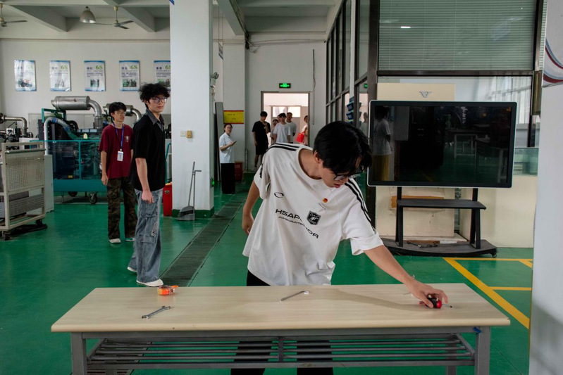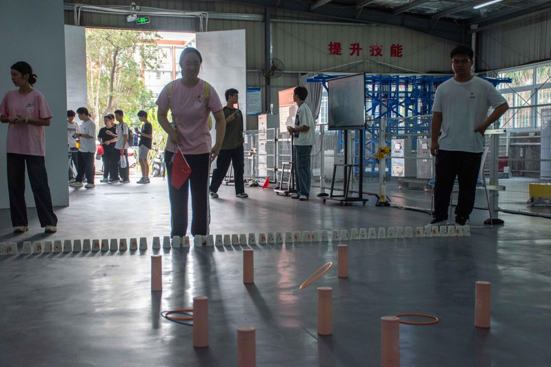 26號(hào)樓智能工程實(shí)訓(xùn)基地前,“找到真正的自己”挑戰(zhàn)現(xiàn)場(chǎng)人頭攢動(dòng)?!按笙蟊亲愚D(zhuǎn) 5 圈”——隨著口令響起,學(xué)子們手扶立柱,在旋轉(zhuǎn)中穩(wěn)住重心;眩暈感未消,便迅速?zèng)_向機(jī)械零件擺放區(qū),爭(zhēng)分奪秒完成任務(wù)。40秒的限時(shí)角逐里,有人踉蹌卻不放棄,有人敏捷又從容,緊張的氛圍中滿是青春的果敢。成功通關(guān)者接過“暖心寄語(yǔ)”,臉上的笑容里藏著突破自我的驕傲。這個(gè)看似簡(jiǎn)單的游戲,讓學(xué)子們?cè)谛D(zhuǎn)中解鎖潛藏的平衡力與專注力,每一圈轉(zhuǎn)動(dòng)都是與自我的對(duì)話,每一次成功都是成長(zhǎng)的勛章。