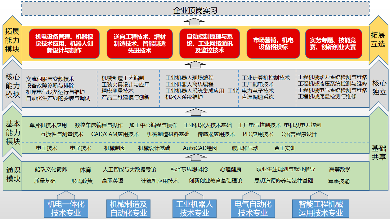交通機(jī)械與智能制造專業(yè)群人才培養(yǎng)目標(biāo)為:培養(yǎng)理想信念堅(jiān)定,德、智、體、美、勞全面發(fā)展,具有一定的科學(xué)文化水平,良好的人文素養(yǎng)、職業(yè)道德、質(zhì)量意識(shí)和創(chuàng)新意識(shí),精益求精的工匠精神,較強(qiáng)的就業(yè)能力和可持續(xù)發(fā)展的能力;掌握本專業(yè)知識(shí)和技術(shù)技能,面向工業(yè)自動(dòng)化電氣設(shè)備生產(chǎn)、自動(dòng)化系統(tǒng)工程、通用設(shè)備制造業(yè),金屬制品、機(jī)械和設(shè)備修理業(yè)的設(shè)備工程技術(shù)人員、自動(dòng)控制工程技術(shù)人員、電工電器工程技術(shù)人員、設(shè)備工程技術(shù)人員、機(jī)械設(shè)備修理人員、機(jī)械加工、制造工藝、數(shù)控機(jī)床操作技術(shù),計(jì)算機(jī)繪圖和CAD/CAM軟件應(yīng)用、工程機(jī)械品牌的售后服務(wù)人員、技術(shù)服務(wù)與營(yíng)銷人員、交通工程建設(shè)施工設(shè)備組織與管理人員等職業(yè)群,能夠從事機(jī)械零件的繪圖、設(shè)計(jì)、制造、工藝編制、機(jī)電一體化設(shè)備生產(chǎn)與維修、自動(dòng)生產(chǎn)線運(yùn)維、工業(yè)機(jī)器人應(yīng)用系統(tǒng)集成、工業(yè)機(jī)器人應(yīng)用系統(tǒng)運(yùn)行維護(hù)、工程機(jī)械性能檢測(cè)與故障維修、機(jī)電一體化設(shè)備安裝與調(diào)試、機(jī)電一體化設(shè)備銷售和技術(shù)支持、機(jī)電一體化設(shè)備技改等工作的高素質(zhì)技術(shù)技能人才。