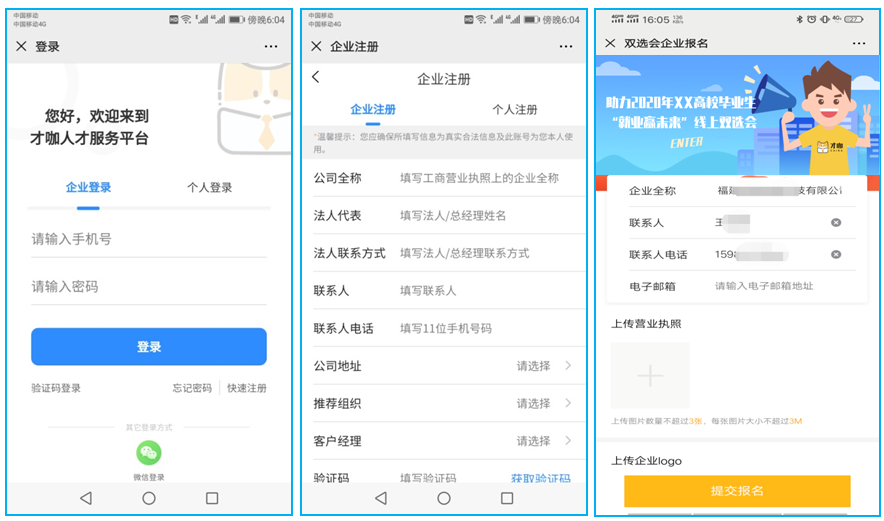企業(yè)報(bào)名需要提交、上傳以下有效信息:企業(yè)營(yíng)業(yè)執(zhí)照,企業(yè)法人姓名、聯(lián)系方式,招聘負(fù)責(zé)人姓名、聯(lián)系方式,發(fā)布真實(shí)招聘崗位。