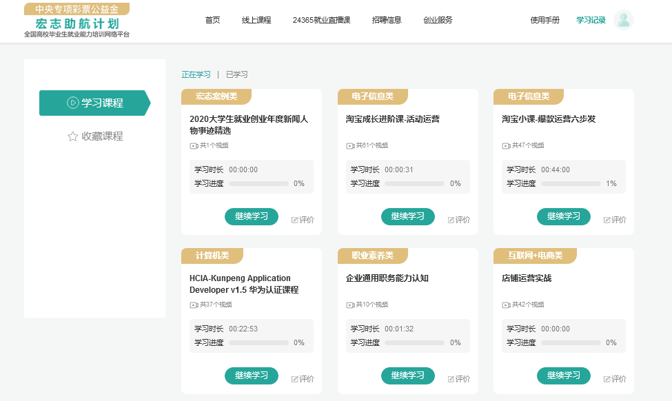 點擊右上角“學習記錄”,可以查看正在學習/已學習、收藏的課程。學習進度超過20%,可對課程做出評價。