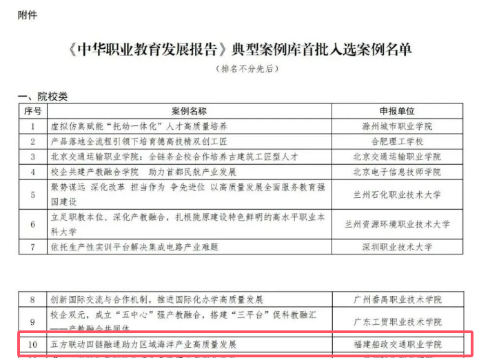 近日,由中華職業(yè)教育社編撰、社會(huì)科學(xué)文獻(xiàn)出版社出版的《中華職業(yè)教育發(fā)展報(bào)告(2023-2024)》在京發(fā)布,我院報(bào)送的《五方聯(lián)動(dòng)四鏈融通助力區(qū)域海洋產(chǎn)業(yè)高質(zhì)量發(fā)展》成功入選《中華職業(yè)教育發(fā)展報(bào)告》典型案例庫首批入選案例名單。
