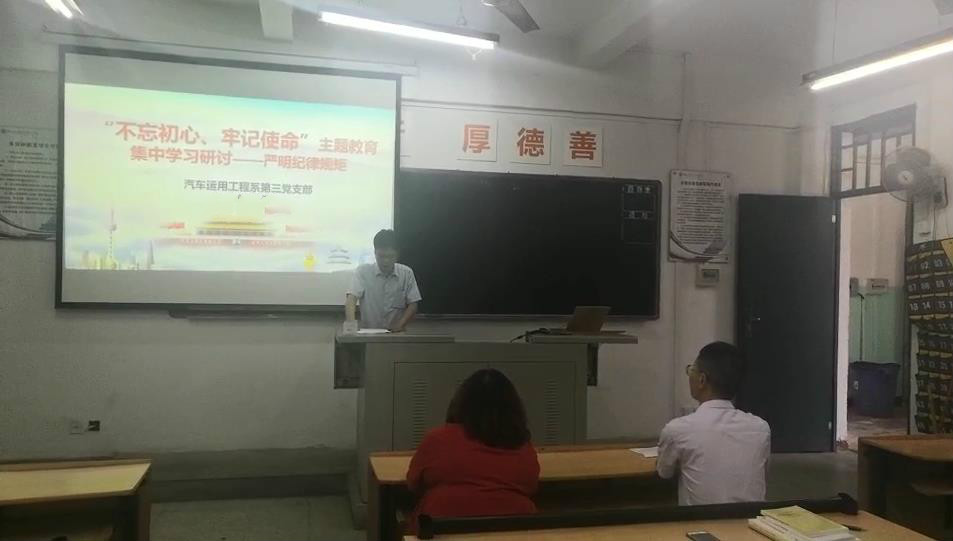 2019年10月18日,汽車系第三黨支部全體黨員,圍繞“不忘初心、牢記使命”主題教育開展第五次專題學習研討,主題為嚴明紀律。會上,陳成春老師作重點發(fā)言,林紹義、黃丹粟老師作互動發(fā)言。陳成春老師“黨的政治紀律是黨的各級組織和全體黨員在思想上、行動上同黨的路線方針政策保持一致的行為規(guī)范,是黨最重要的紀律。嚴守黨的政治紀律,對于鞏固黨的團結(jié)統(tǒng)一,保持黨的先進性和純潔性,增強黨的凝聚力和戰(zhàn)斗力,保證黨的路線方針政策和決策部署的貫徹落實至關(guān)重要。