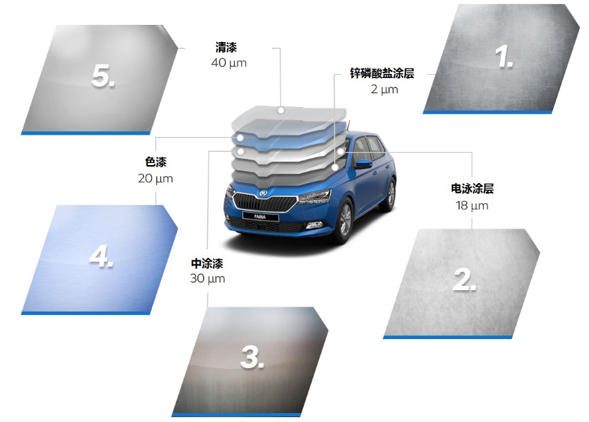 對(duì)于汽車而言,車漆除了具有裝飾性外,還具有防腐、防銹、耐高低溫、耐污、耐沖擊等防護(hù)性能。因此,原廠車漆不只簡(jiǎn)單的一層,而一般是由鋅磷酸鹽、電泳漆、中涂漆、色漆和清漆等涂層組成。