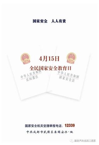 18汽營(yíng)一班 張曉玲 汽車系學(xué)生會(huì)主席團(tuán)成員:“國(guó)安才能國(guó)治,治國(guó)必先治安"。4月15日,是國(guó)家安全教育日,更準(zhǔn)確的說(shuō)法是全民國(guó)家安全教育日,今年的4月15日是首個(gè)全民國(guó)家安全教育日。今天學(xué)校組織我們觀看全民國(guó)家安全教育日的直播,其實(shí)很多的危險(xiǎn)都潛藏在我們的身邊,我們應(yīng)該小心謹(jǐn)慎面對(duì)。國(guó)泰民安是人民群眾最基本最普遍的愿望,我們不僅僅要在這一天學(xué)習(xí)國(guó)家安全知識(shí),而應(yīng)該融入現(xiàn)實(shí)的每一天里,好好保護(hù)我們的祖國(guó)。