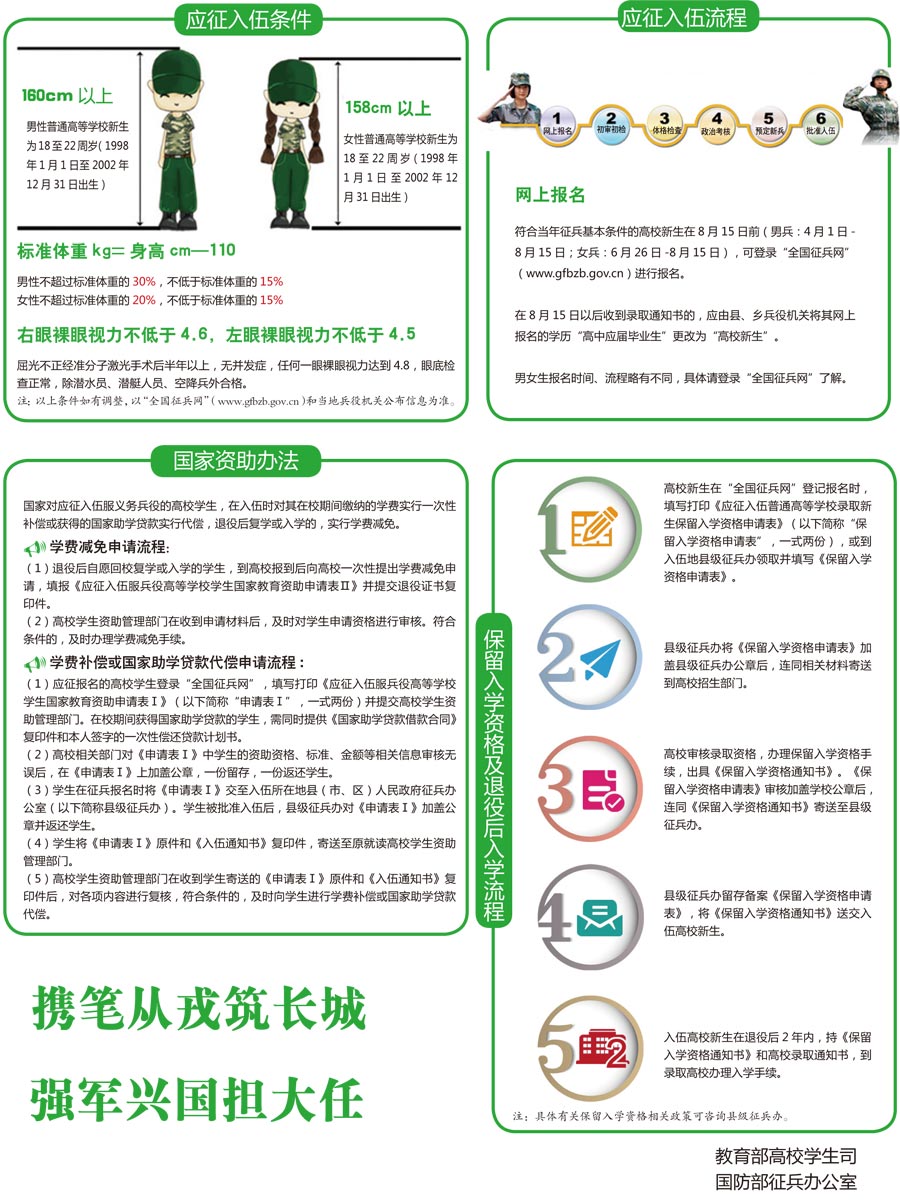 4、應(yīng)征入伍同學(xué)提供入伍證復(fù)印件辦理保留學(xué)籍手續(xù),退役復(fù)學(xué)同學(xué)提供退役證復(fù)印件辦理復(fù)學(xué)手續(xù)。
