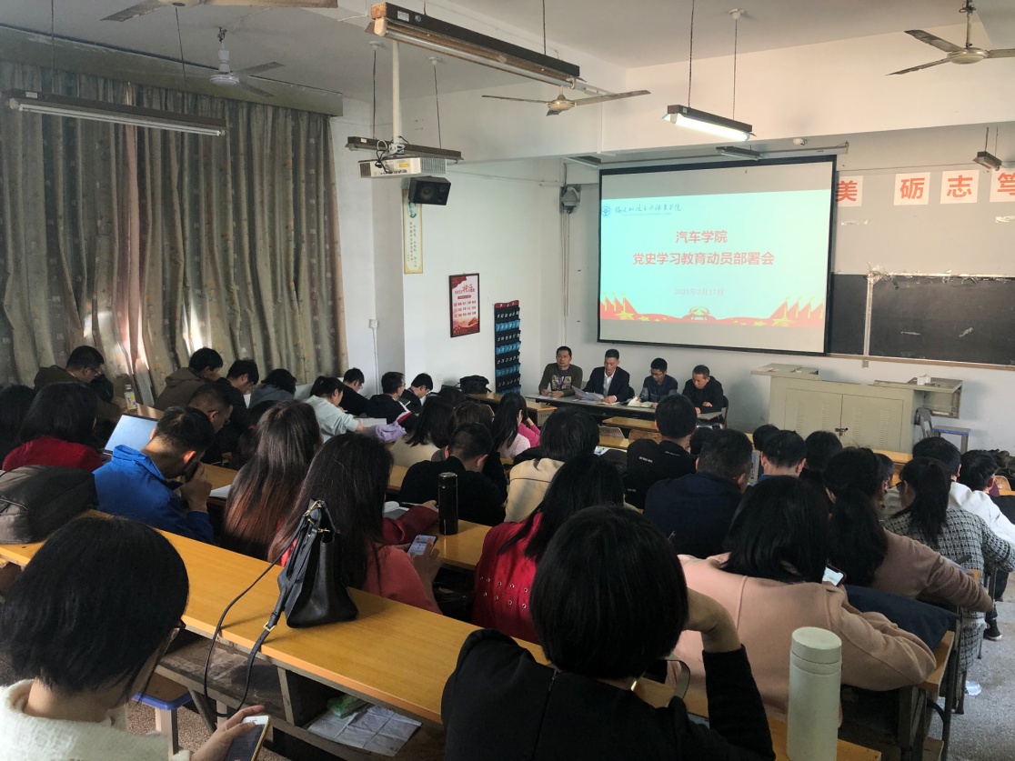 2021317日下午,汽車學院黨總支在22號樓二階召開黨史學習教育動員部署會,學習貫徹習近平總書記在黨史學習教育動員大會上的重要講話精神,傳達了學校關于全面開展黨史學習教育部署動員大會會議精神。學院領導班子成員、全體黨員等參加會議。