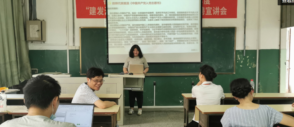 為了迎接黨的100周歲生日,由支部書記朱劍寶同志帶領(lǐng)大家重溫入黨誓詞,本支部最年輕的黨員黃丹粟同志作為青年教師代表重溫入黨志愿書。拉開了本次學(xué)習(xí)活動的序幕。與往常不同的開場方式將本次學(xué)習(xí)活動推向一個小高潮,充分調(diào)動了黨員學(xué)習(xí)的熱情。