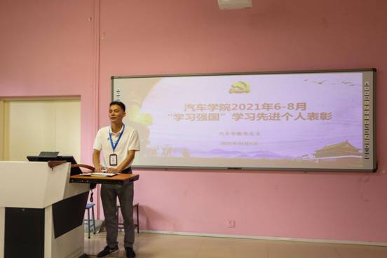 為進(jìn)一步學(xué)好用好“學(xué)習(xí)強(qiáng)國”學(xué)習(xí)平臺,持續(xù)深入學(xué)習(xí)宣傳貫徹習(xí)近平新時(shí)代中國特色社會主義思想,推動汽車學(xué)院廣大黨員、干部廣泛運(yùn)用“學(xué)習(xí)強(qiáng)國”學(xué)習(xí)平臺開展好網(wǎng)上學(xué)習(xí),提高學(xué)習(xí)積極性,形成“比學(xué)趕超”濃郁氛圍,2021年10月6日下午,汽車學(xué)院在2號樓1-3教室,舉行“學(xué)習(xí)強(qiáng)國”優(yōu)秀先進(jìn)個(gè)人表彰會,汽車學(xué)院全體教職工黨員參加本次會議,會議由蔡華錦書記主持。