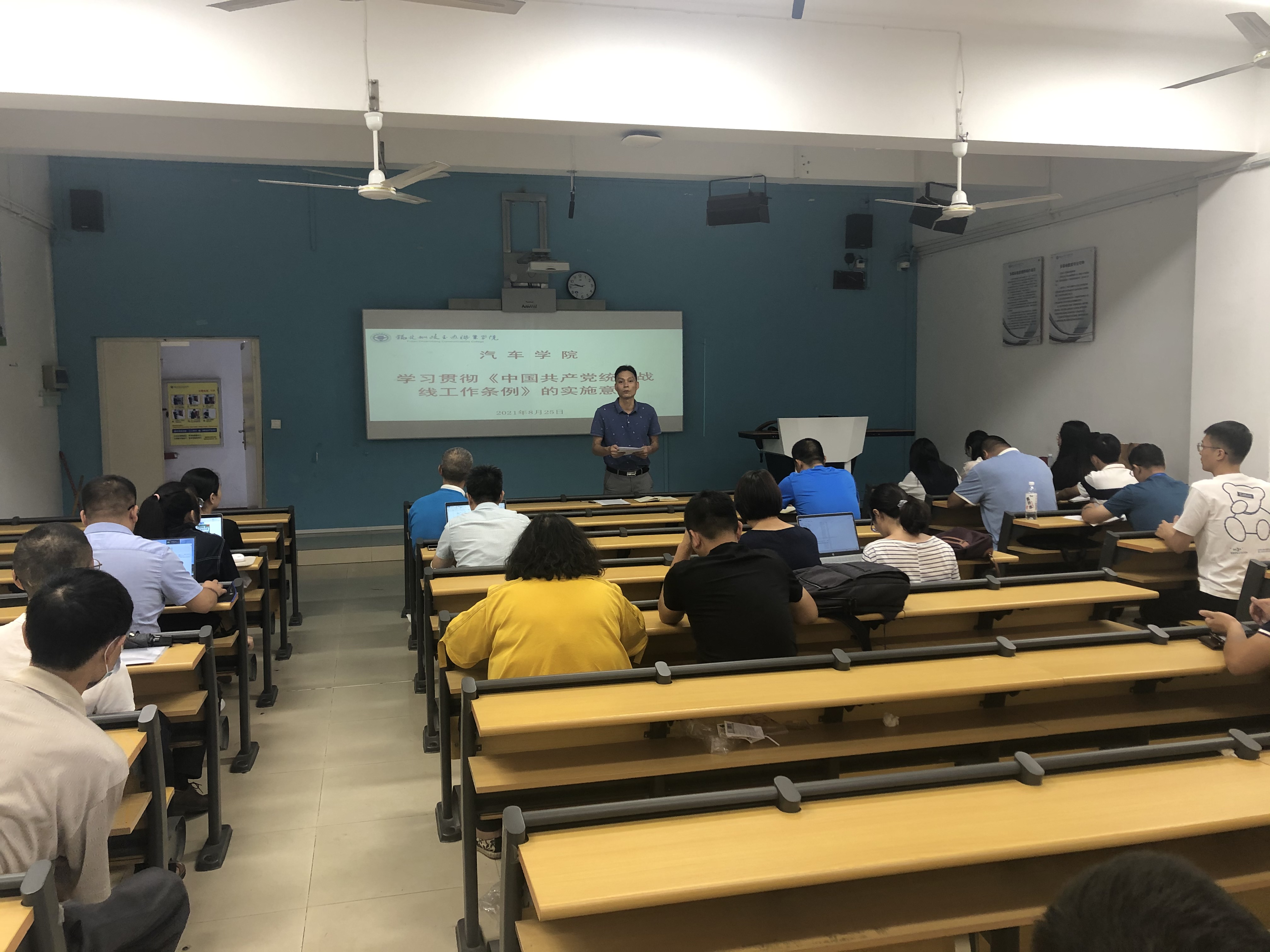 8月25日,汽車學院黨總支召開全體教職工大會,組織學習中共福建省委印發(fā)《關于貫徹〈中國共產(chǎn)黨統(tǒng)一戰(zhàn)線工作條例〉的實施意見》(以下簡稱《實施意見》),學院領導及全體教師、輔導員參加本次會議。