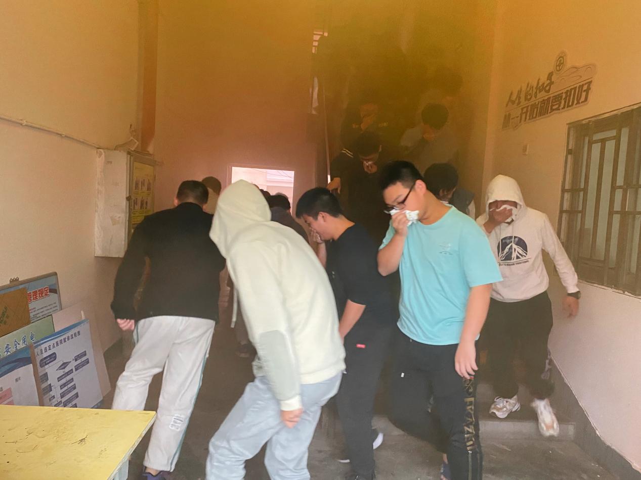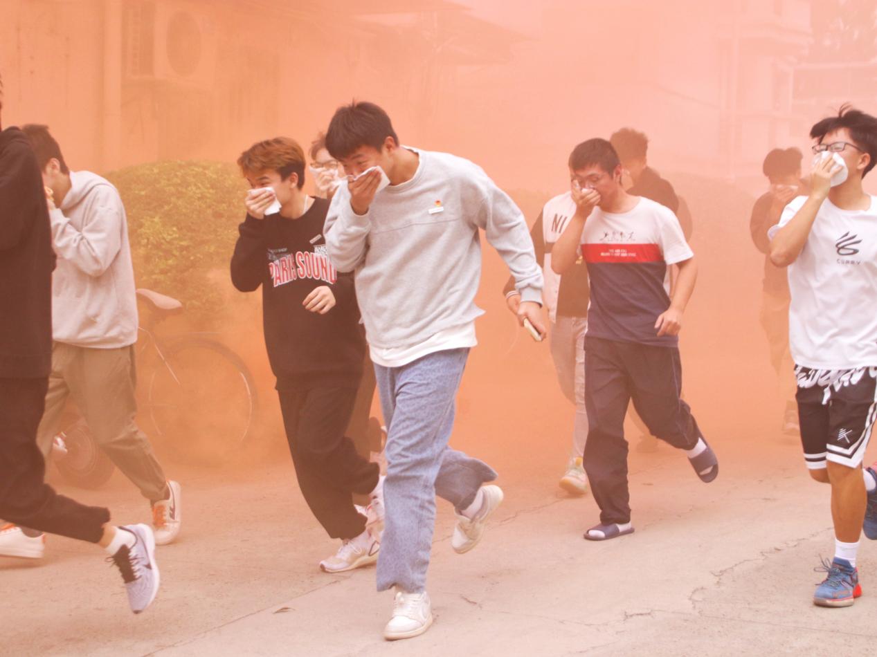 在北區(qū)24號汽車學院學生宿舍樓,一陣急促的火情報警鈴響起,汽車學院學生在志愿者的引導下,彎著腰,用濕手帕、濕毛巾等捂住口鼻,沿著疏散通道快速撤離到指定的安全區(qū)域,同學們迅速整隊并核查人數(shù),整個應急演練活動有序、緊張、安全、高效,達到了預期效果。