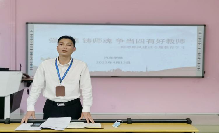 4月13日,汽車學(xué)院召開全體教職工大會,以“強(qiáng)師德,鑄師魂,爭當(dāng)四有好教師”為主題進(jìn)行師德師風(fēng)建設(shè)專題教育學(xué)習(xí)。學(xué)院黨總支書記蔡華錦主持會議,全體教職工參會。