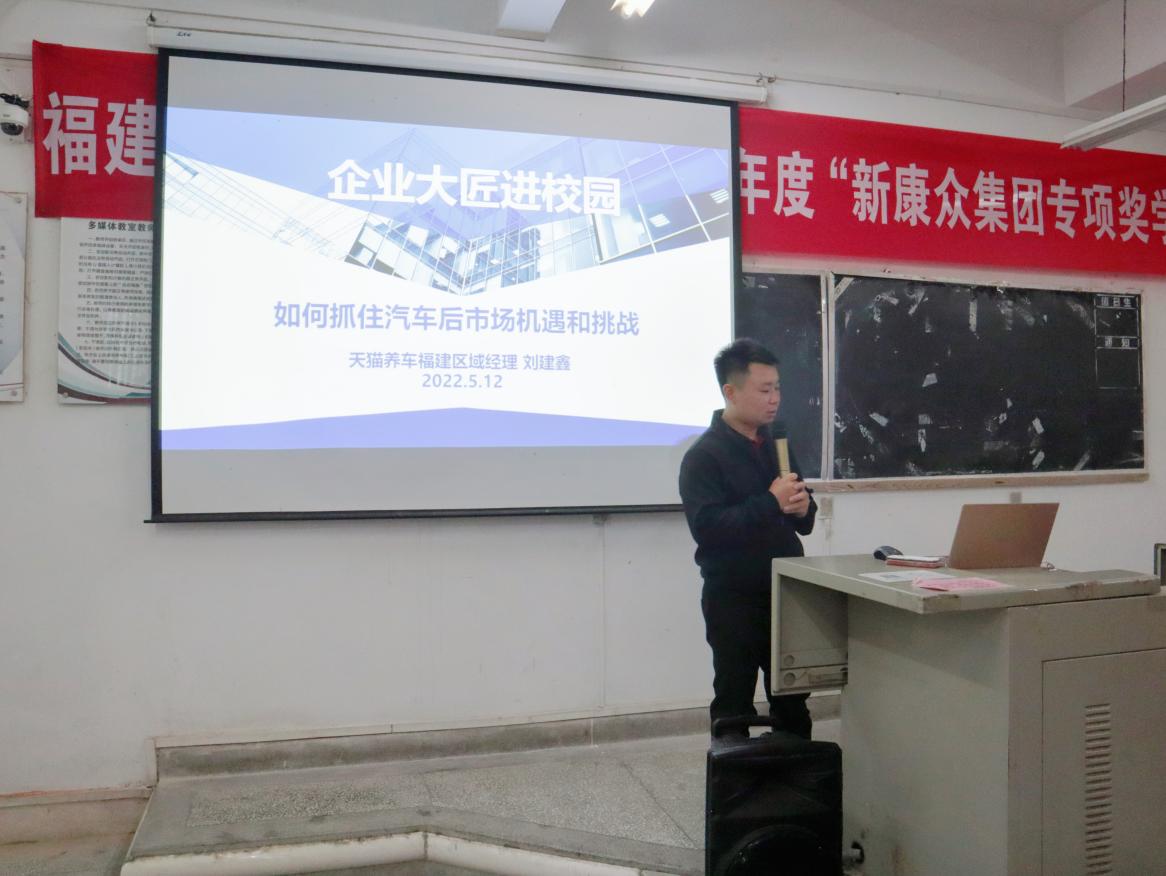 2022年5月12日,由新康眾集團(tuán)(天貓養(yǎng)車)福建區(qū)域經(jīng)理劉建鑫,主管陳玲一行蒞臨汽車學(xué)院舉行專場招聘會(huì)暨新康眾獎(jiǎng)學(xué)金發(fā)放儀式。汽車學(xué)院蔡華錦書記、朱劍寶副院長、教研室主任及部分骨干教師參加了本次交流。劉建鑫經(jīng)理為畢業(yè)生們講述了面對疫情如何抓住汽車后市場機(jī)遇和挑戰(zhàn),新康眾集團(tuán)目前為我校提供涵蓋全省九地市的30多個(gè)崗位。希望繼續(xù)與汽車學(xué)院在人才培養(yǎng)、文化傳承等方面開展深度合作,實(shí)現(xiàn)產(chǎn)教融合、互利共贏。在劉經(jīng)理宣講之后,新康眾集團(tuán)進(jìn)行專項(xiàng)獎(jiǎng)學(xué)金的頒發(fā)。