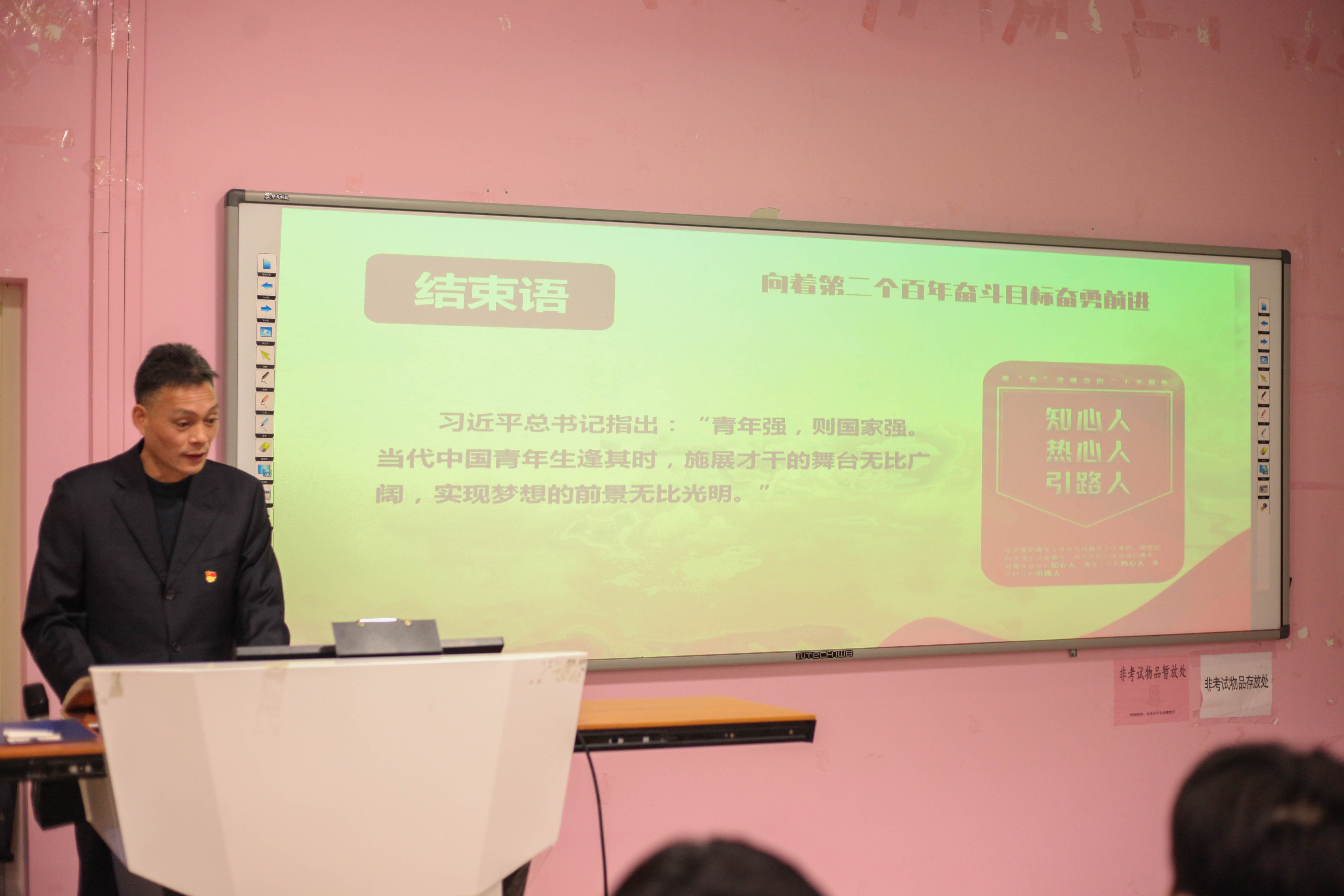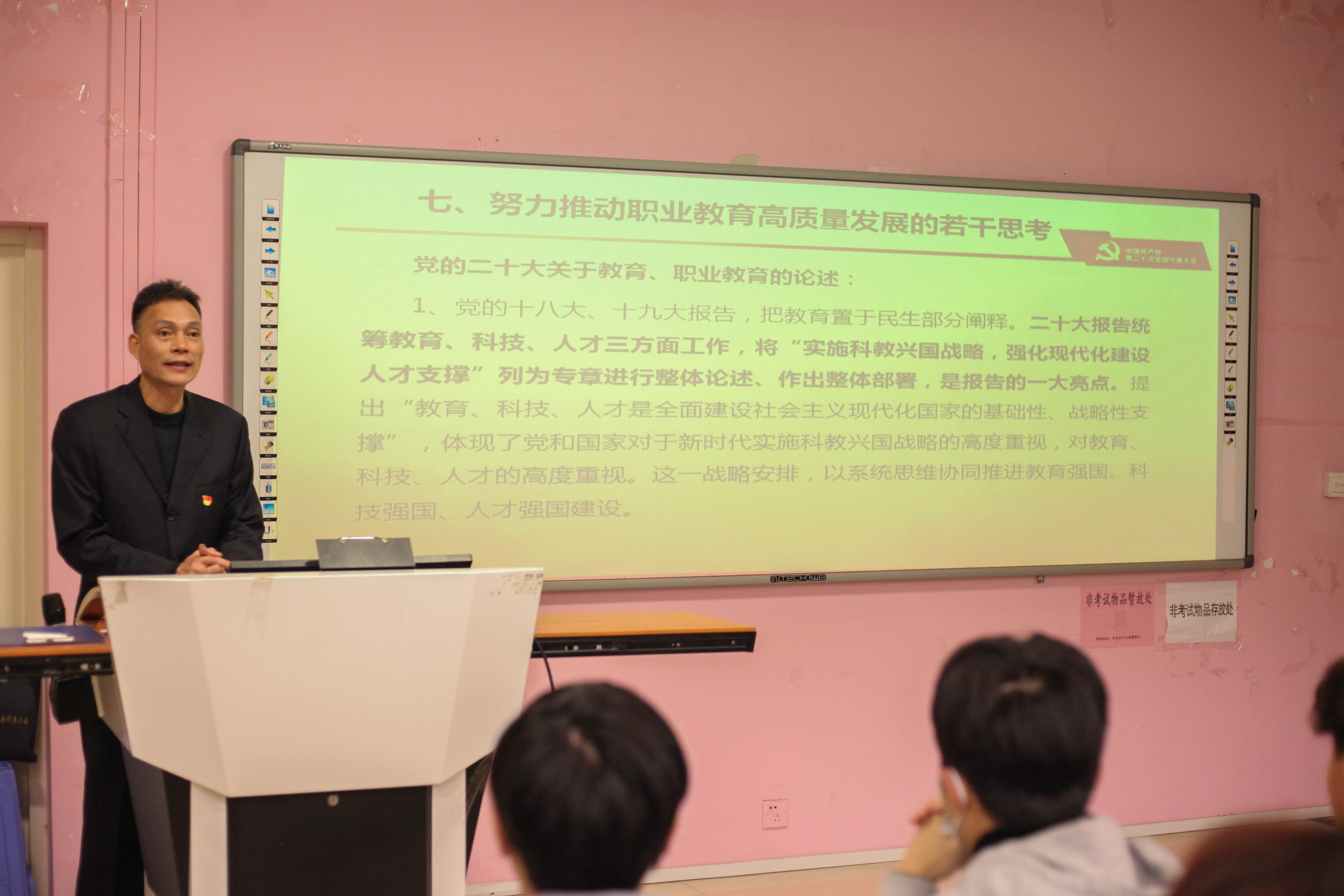 蔡華錦書記從“黨的二十大主題:大會內(nèi)容和精神的高度概括”、“過去5年的工作和新時代10年的偉大變革”、“開辟馬克思主義中國化時代化新境界”、“以中國式現(xiàn)代化全面推進中華民族偉大復(fù)興”、“黨和國家事業(yè)的新部署新要求”、“堅定不移推進全面從嚴治黨的部署和要求”、“努力推動職業(yè)教育高質(zhì)量發(fā)展的若干思考”七個方面展開宣講。引導(dǎo)青年學(xué)生們對中國式現(xiàn)代化知其然、知其所以然,弘揚偉大建黨精神,自信自強、守正創(chuàng)新,踔厲奮發(fā),勇毅前行,以更飽滿的精神面貌貢獻自己的青春力量。