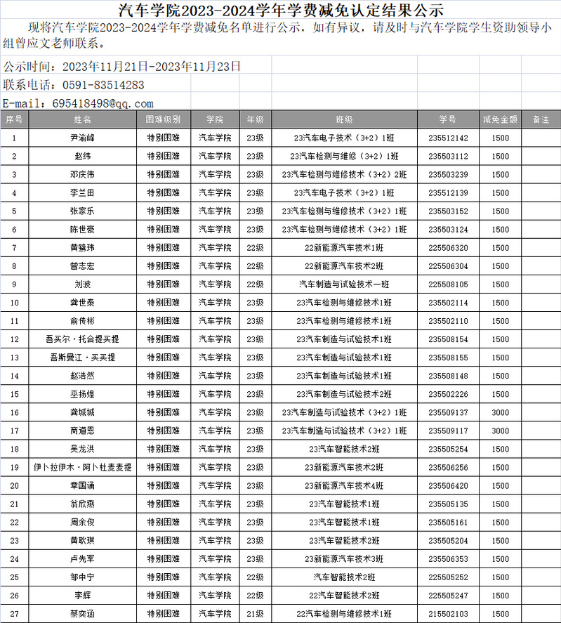 汽車學(xué)院2023-2024學(xué)年學(xué)費(fèi)減免認(rèn)定結(jié)果公示