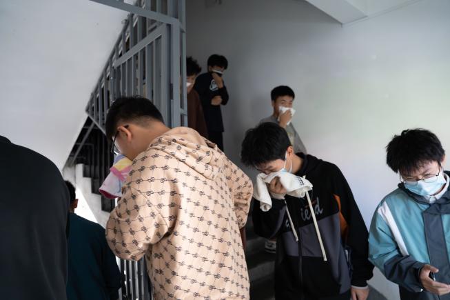 中午12:30,伴隨著警報聲長鳴,應(yīng)急疏散演練正式開始,各樓棟、各樓層在班級班長和宿舍長的統(tǒng)一引導(dǎo)下,全體同學(xué)立刻作出響應(yīng),用濕毛巾捂住口鼻,貓著腰,迅速從安全通道進(jìn)行疏散,到達(dá)指定地點(diǎn)后,由紀(jì)保部疏散演練小組清點(diǎn)人數(shù),并向陳澤承老師匯報各班級集合情況。