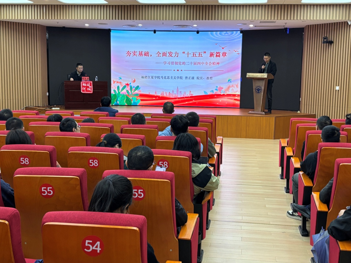 為深入學(xué)習(xí)貫徹習(xí)近平總書記在黨的二十屆四中全會上的重要講話精神和《中共中央關(guān)于制定國民經(jīng)濟(jì)和社會發(fā)展第十五個五年規(guī)劃的建議》,深刻認(rèn)識全會的重大意義, 11月12日下午,特邀福建江夏學(xué)院馬克思主義學(xué)院院長曾正滋教授以夯實(shí)基礎(chǔ),全面發(fā)力“十五五”新篇章為主題的學(xué)習(xí)貫徹黨的二十屆四中全會精神專題講座。