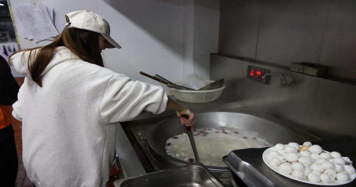 湯圓包好后,工作人員掄起鍋勺,開始下鍋煮湯圓。在老少、師生圍坐在一起聊著日常的同時,一鍋熱騰騰的湯圓端上來餐桌,湯圓一口咬下去,香氣四溢,滿是甜蜜。