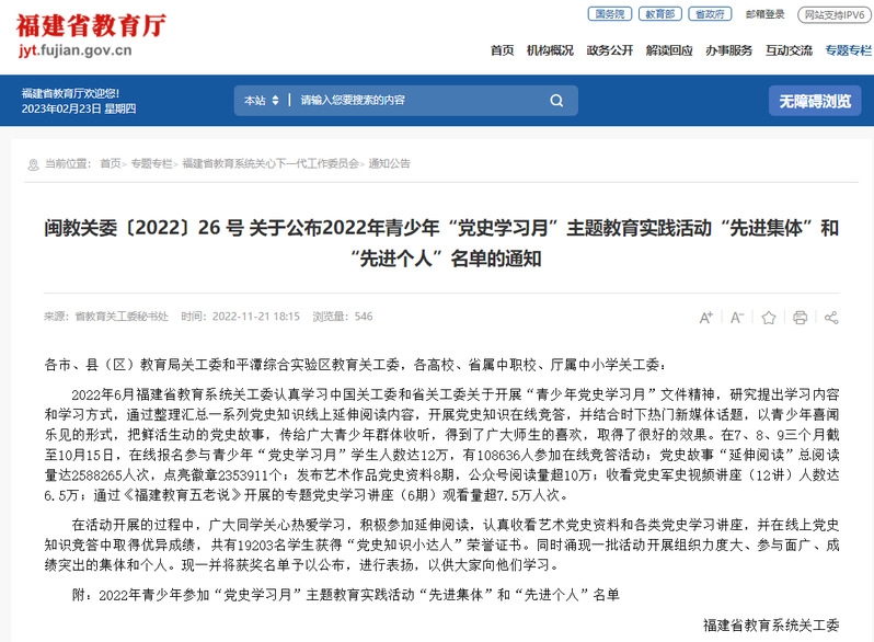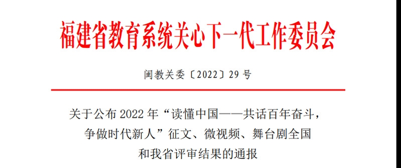日前,福建省教育系統(tǒng)關(guān)工委公布了2022年《福建教育五老說》欄目收看組織工作先進集體和先進個人表揚名單、2022年青少年“黨史學(xué)習(xí)月”主題教育實踐活動“先進集體”和“先進個人”名單以及 2022 年“讀懂中國——共話百年奮斗, 爭做時代新人”舞臺劇評審結(jié)果,我校關(guān)工委榮獲先進集體2個,先進個人1名,舞臺劇《黨徽》榮獲最佳作品獎。