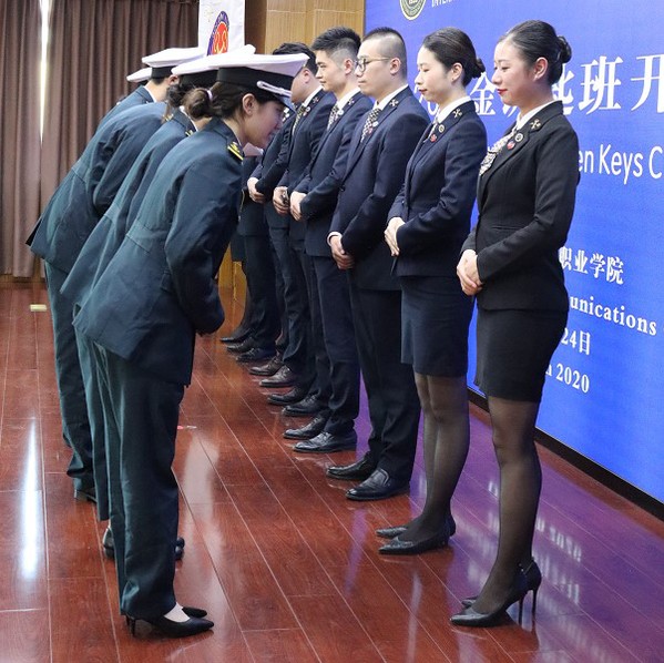 隨后舉行了國際金鑰匙船政分院2020級金鑰匙班開班儀式,張勇先生介紹院校金鑰匙高端服務(wù)人才培養(yǎng)模式;船政分院17名同學(xué)舉行了拜師儀式,集團代表帶領(lǐng)學(xué)員集體宣誓,學(xué)員代表發(fā)言。