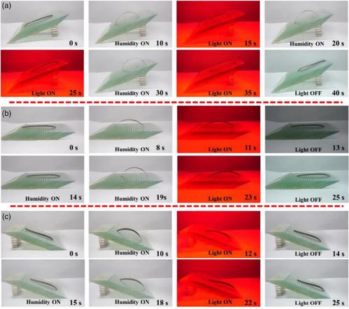 為了驗(yàn)證執(zhí)行器在實(shí)際應(yīng)用中的潛力,提出了三種基于執(zhí)行器的演示模型。第一個(gè)模型是仿生花(圖4)。通過(guò)交替加濕和近紅外光照射,可以表現(xiàn)出雙向彎曲變形,模仿自然花朵的開(kāi)合運(yùn)動(dòng)。