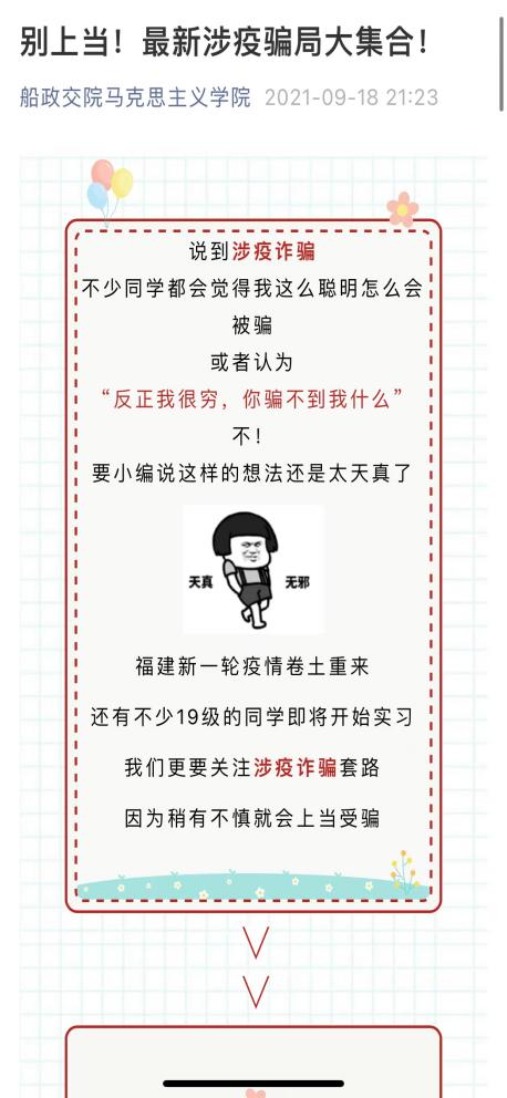 3.志愿服務(wù),護航學(xué)生健康。在福建疫情反反復(fù)復(fù),威脅師生健康時,學(xué)院教學(xué)轉(zhuǎn)入線上進行期間,第二支部黨員全員報名參加黨員先鋒崗志愿服務(wù)門衛(wèi)值班,還為需要的學(xué)生提供談心談話服務(wù),用自己的行動在抗疫一線中,踐行黨員的愛生護生情懷。通過學(xué)院微信公眾號,依托船政青年說、思想先聲、防疫心理訓(xùn)練營等專欄。幫助學(xué)生保持良好、健康的心理狀態(tài),大力宣傳榜樣學(xué)生,激勵引導(dǎo)廣大船政青年樹立遠大理想。