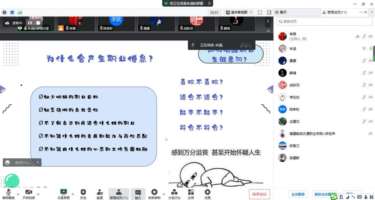 最后在場的專兼職教師對本模塊內容的教學難點、疑問開展了經驗交流和討論,大家表示本次教研活動形式新穎、效果突出,通過大家的交流和分享均收獲良多。同時,本次線上會議通過信息化技術開啟了現(xiàn)場錄制,方便老師們重復觀看,提升了教研活動的質量。