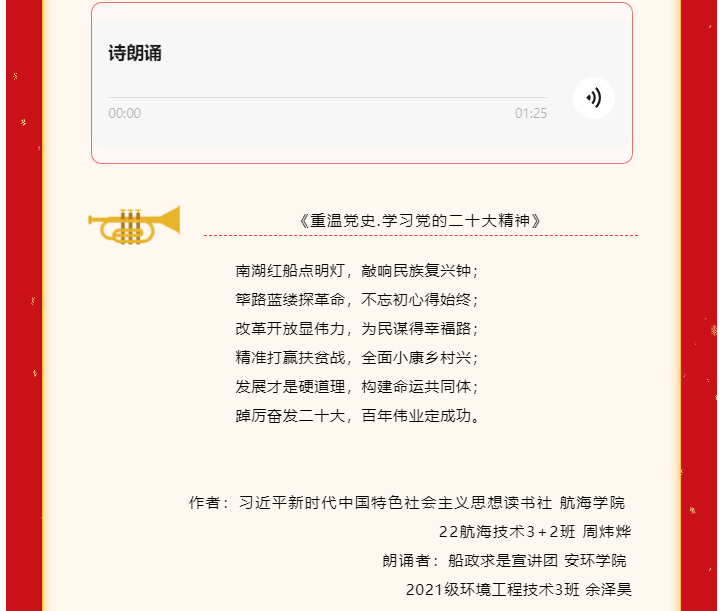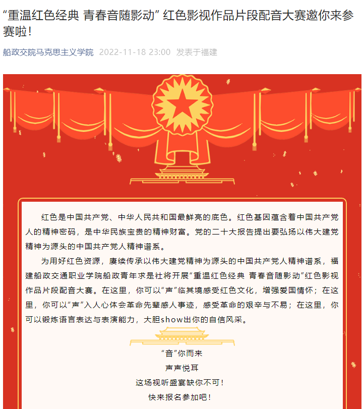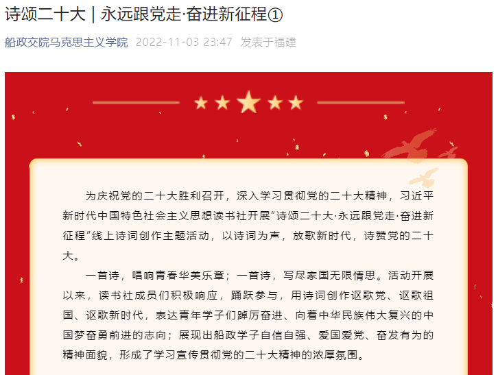 為進(jìn)一步落實(shí)好黨的二十大精神進(jìn)頭腦,馬克思主義學(xué)院用好第一課堂和第二課堂,以形式豐富的活動(dòng)方式激發(fā)青年大學(xué)生的學(xué)習(xí)熱情。習(xí)近平新時(shí)代中國(guó)特色社會(huì)主義思想教研室在全校開(kāi)展“黨的二十大知識(shí)競(jìng)賽”,組織學(xué)生制作學(xué)習(xí)筆記、金句書法等作品;指導(dǎo)讀書社學(xué)生開(kāi)展“詩(shī)頌黨的二十大·永遠(yuǎn)跟黨走·奮進(jìn)新征程”線上詩(shī)詞創(chuàng)作主題活動(dòng),以詩(shī)詞為聲,放歌新時(shí)代,詩(shī)贊黨的二十大;船政青年求是社開(kāi)展“重溫紅色經(jīng)典,青春音隨影動(dòng)”主題紅色影視作品片段配音大賽,弘揚(yáng)偉大建黨精神;集體備課,成立黨的二十大精神師生宣講報(bào)告團(tuán)。通過(guò)這一系列舉措力求對(duì)黨的二十大精神學(xué)深學(xué)透、融會(huì)貫通,最終把學(xué)習(xí)、實(shí)踐成果轉(zhuǎn)化為推進(jìn)學(xué)校高質(zhì)量發(fā)展的不竭動(dòng)力。