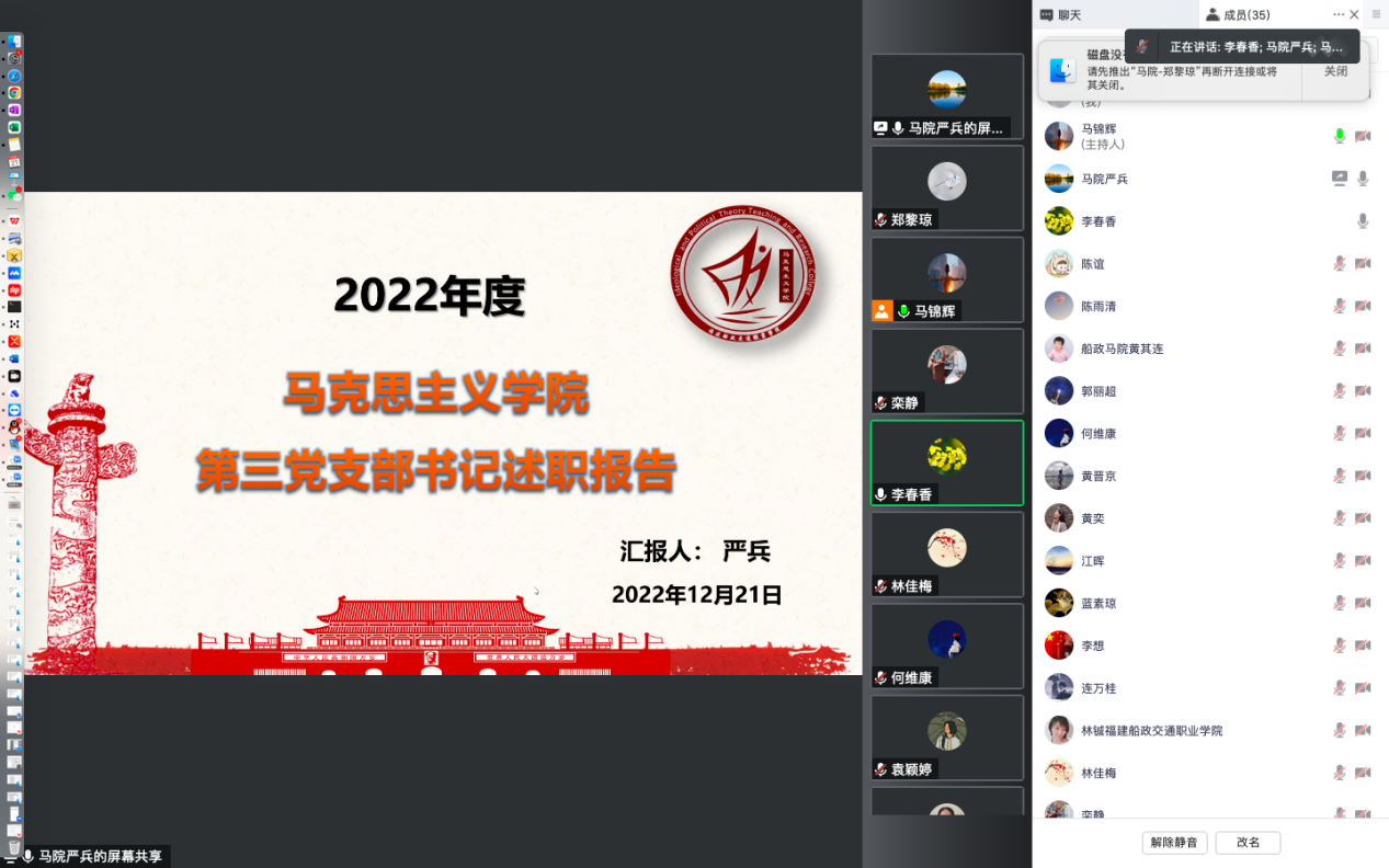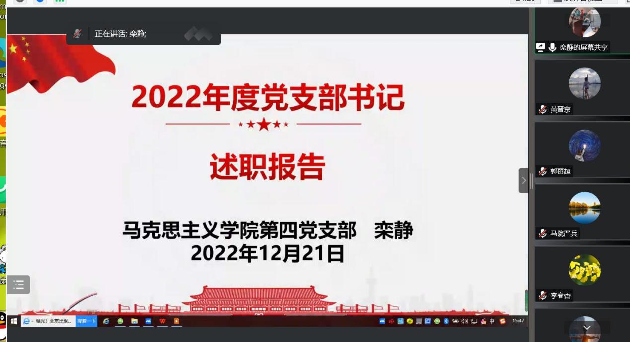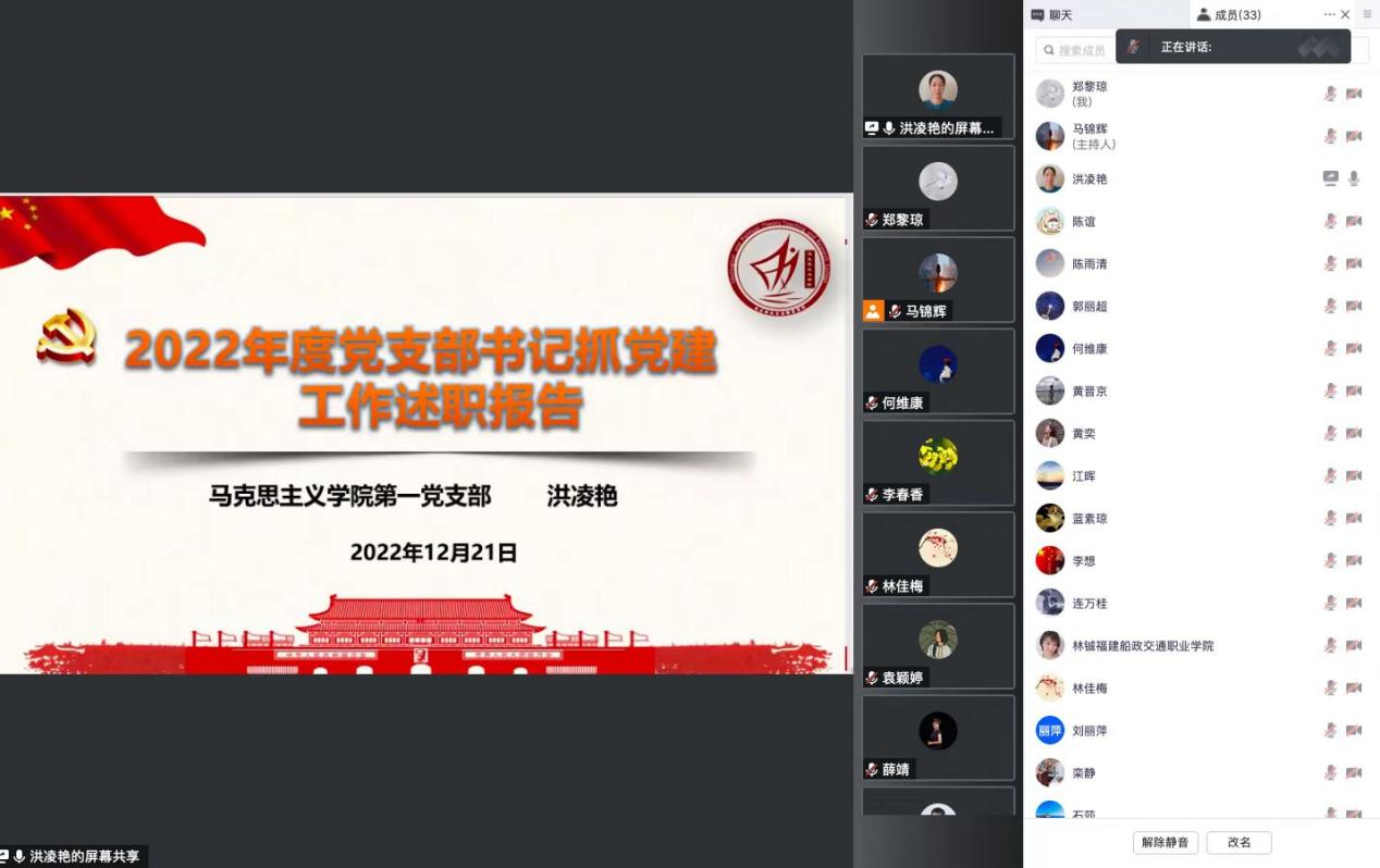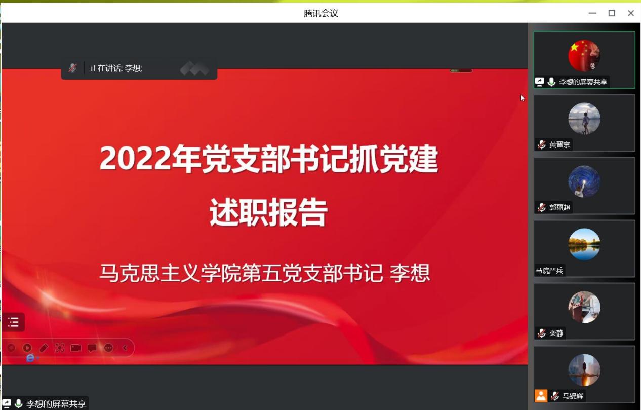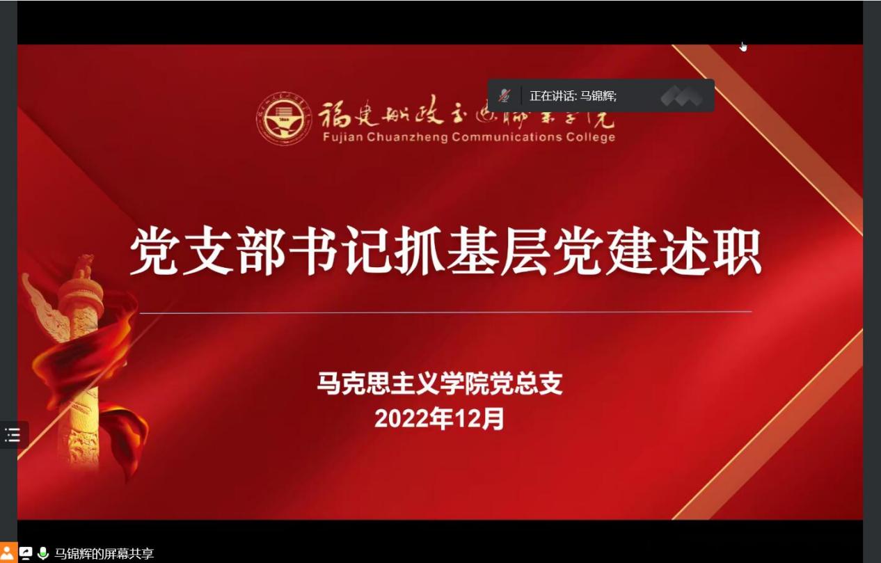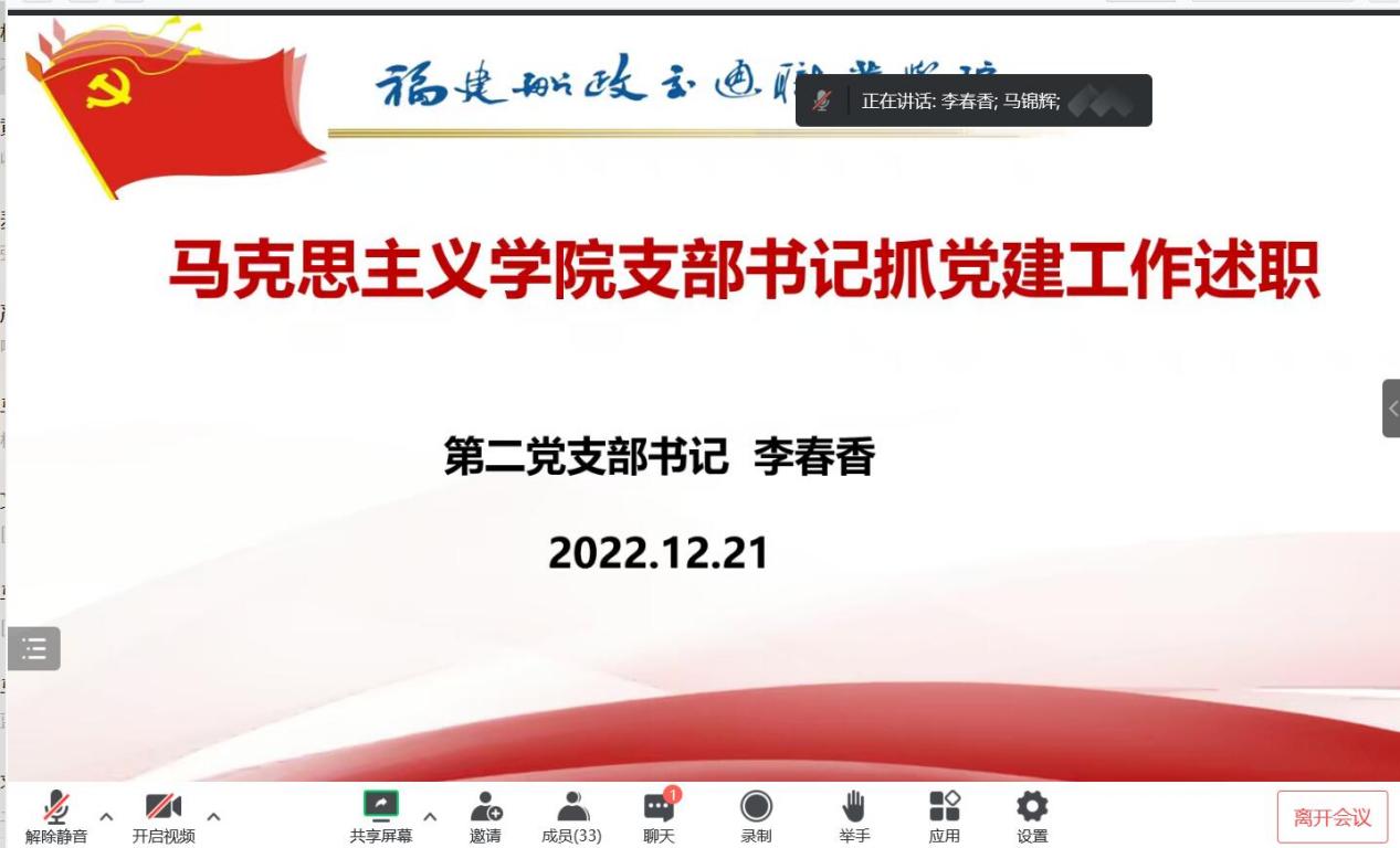 2022年12月21日下午,馬克思主義學院在線召開2022年度黨支部書記抓基層黨建工作述職會,馬克思主義全體教師參加本次會議。會議由馬克思主義學院副院長馬錦輝主持。