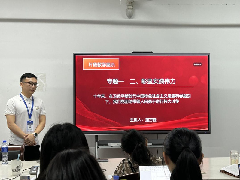嚴(yán)兵老師從習(xí)近平新時(shí)代中國特色社會(huì)主義思想創(chuàng)立的時(shí)代背景和實(shí)踐偉力,以及貫穿這一思想的立場(chǎng)觀點(diǎn)方法出發(fā),讓學(xué)生充分認(rèn)識(shí)到,這一思想實(shí)現(xiàn)了馬克思主義中國化時(shí)代化新的飛躍,不斷增進(jìn)政治認(rèn)同、思想認(rèn)同、理論認(rèn)同、情感認(rèn)同。嚴(yán)兵老師綜合運(yùn)用案例法、討論法、提問法、視頻法等多種教學(xué)方法,組織學(xué)生積極思考,層層遞進(jìn)探究進(jìn)而得出結(jié)論,體現(xiàn)了以學(xué)生為主體、以教師為主導(dǎo)的教學(xué)理念,得到了老師們的好評(píng)。