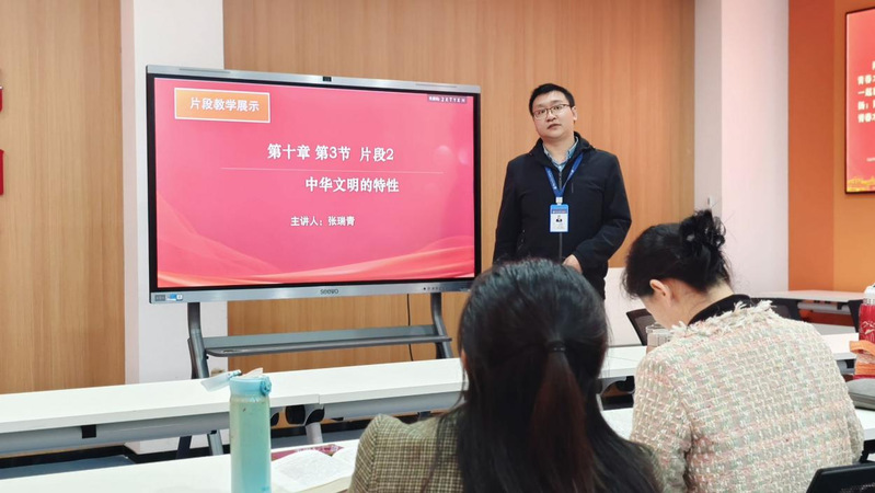 張玉祥和張瑞青兩位老師分別就《繁榮發(fā)展社會(huì)主義文化事業(yè)和文化產(chǎn)業(yè)》與《中華文明五大特性》兩個(gè)教學(xué)內(nèi)容展開片段教學(xué)展示。他們采用生動(dòng)的案例,講授內(nèi)容條理清晰,綜合運(yùn)用多種教學(xué)方法,既體現(xiàn)了思政課教學(xué)的學(xué)理性,也突顯了高職思政課教學(xué)的生動(dòng)性,取得了良好的示范效果。