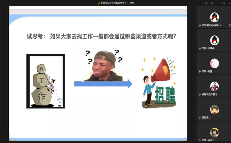 接著,吳建新老師針對(duì)畢業(yè)生獲取就業(yè)信息的渠道和方法進(jìn)行了片段教學(xué)。