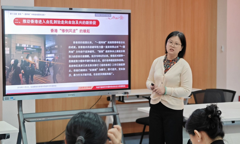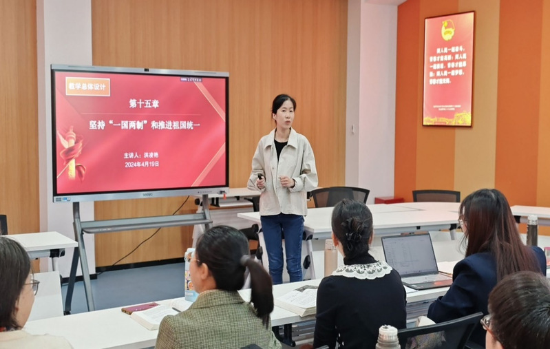 備課活動圍繞《習(xí)近平新時代中國特色社會主義思想概論》課程第十五章《堅持“一國兩制”和推進(jìn)祖國統(tǒng)一》展開。洪凌艷老師擔(dān)任教學(xué)設(shè)計主講,趙黎老師與連萬桂老師分別做片段教學(xué)。