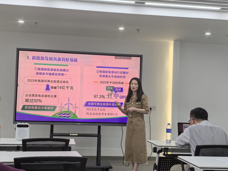 余夢莉、劉露老師兩位老師針對“新能源發(fā)展具備良好基礎”“正確認識新能源高質量發(fā)展” 展開片段教學。通過設置 “發(fā)展新能源是否取代傳統(tǒng)能源” 等問題鏈,結合2024年全國節(jié)能宣傳周主題,運用案例分享與互動,讓學生明晰新能源發(fā)展路徑,強化學生對新能源高質量發(fā)展的理解。