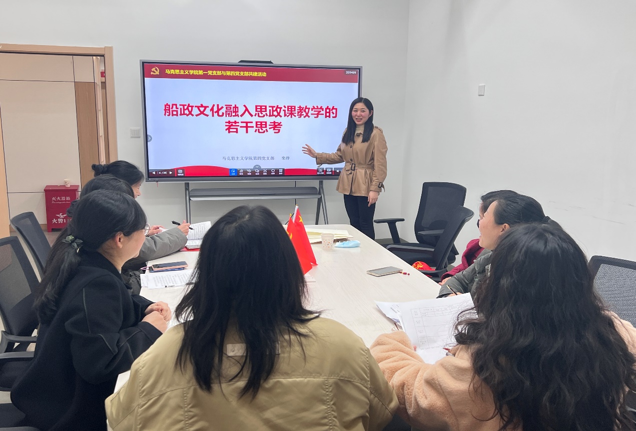 第四黨支部建在船政文化教研室上,支部成員中有兩位是正高級職稱,師資基礎(chǔ)雄厚。共建活動中,第四黨支部書記欒靜分享了將船政文化有機(jī)融入思政課的一些認(rèn)識;科研能力較強(qiáng)的江冰教授分享了她在課題申報(bào)、結(jié)項(xiàng)方面的經(jīng)驗(yàn)。