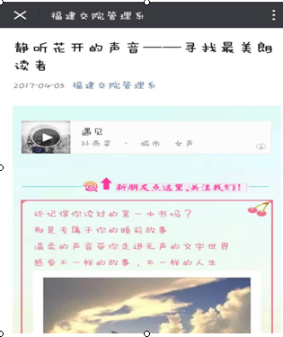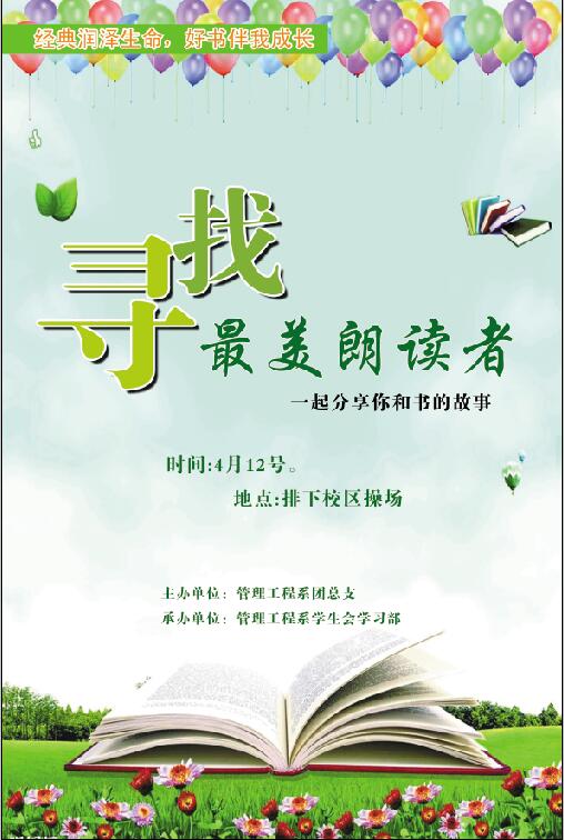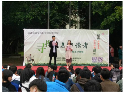 為了大力響應國家關于全民閱讀的號召,傳播社會主義先進文化,提高廣大船政學子的文化素質(zhì),濃厚校園學習氛圍,形成我院學生良好的學習風氣,展現(xiàn)船政學子的風采,樹立良好的社會形象,引導大家走進閱讀社會,共享閱讀快樂,多讀書,讀好書,與好書相伴,學院圖書館于2017年4月1日至4月20日期間,在全院范圍內(nèi)開展“福建船政交通職業(yè)學院圖書館讀書日2017世界詩歌日特別活動”。作為活動分會場,管理工程系于2017年4月12日在排下校區(qū)操場舉辦了“尋找最美朗讀者”活動。
