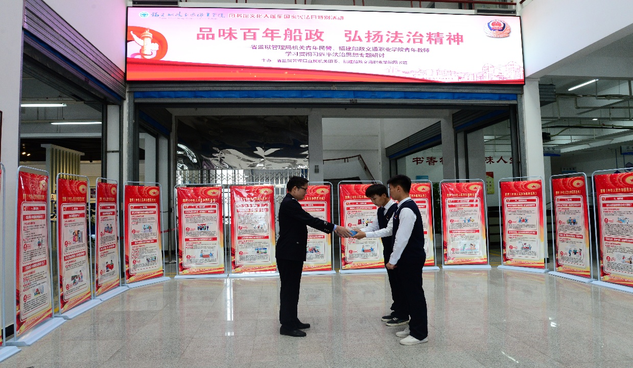 2020年12月7日,值此第七個(gè)國家憲法日到來之際,福建船政交通職業(yè)學(xué)院圖書館文化大篷車舉行國家憲法日特別活動(dòng)——學(xué)習(xí)貫徹習(xí)近平法治思想專題研討活動(dòng)。省監(jiān)獄管理局機(jī)關(guān)刑罰執(zhí)行處副處長吳建山向我院學(xué)生贈(zèng)送憲法宣傳冊。