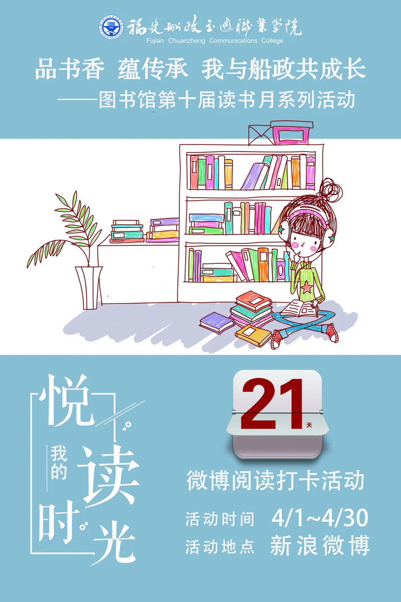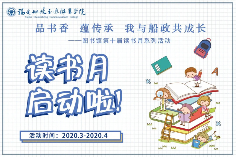 為了引導(dǎo)廣大師生養(yǎng)成多讀書、讀好書、好讀書的習(xí)慣,在第25個(gè)“世界讀書日”來臨之際,我院圖書館于2020年3月—4月開展“品書香,蘊(yùn)船政,我與船政共成長”圖書館第十屆讀書月系列活動(dòng),活動(dòng)包含豐富多彩、形式多樣的線上閱讀活動(dòng),同時(shí)我們也為大家準(zhǔn)備了各種精美的禮品。希望廣大師生及時(shí)關(guān)注我館的微博、微信公眾號(hào),歡迎大家的參與!