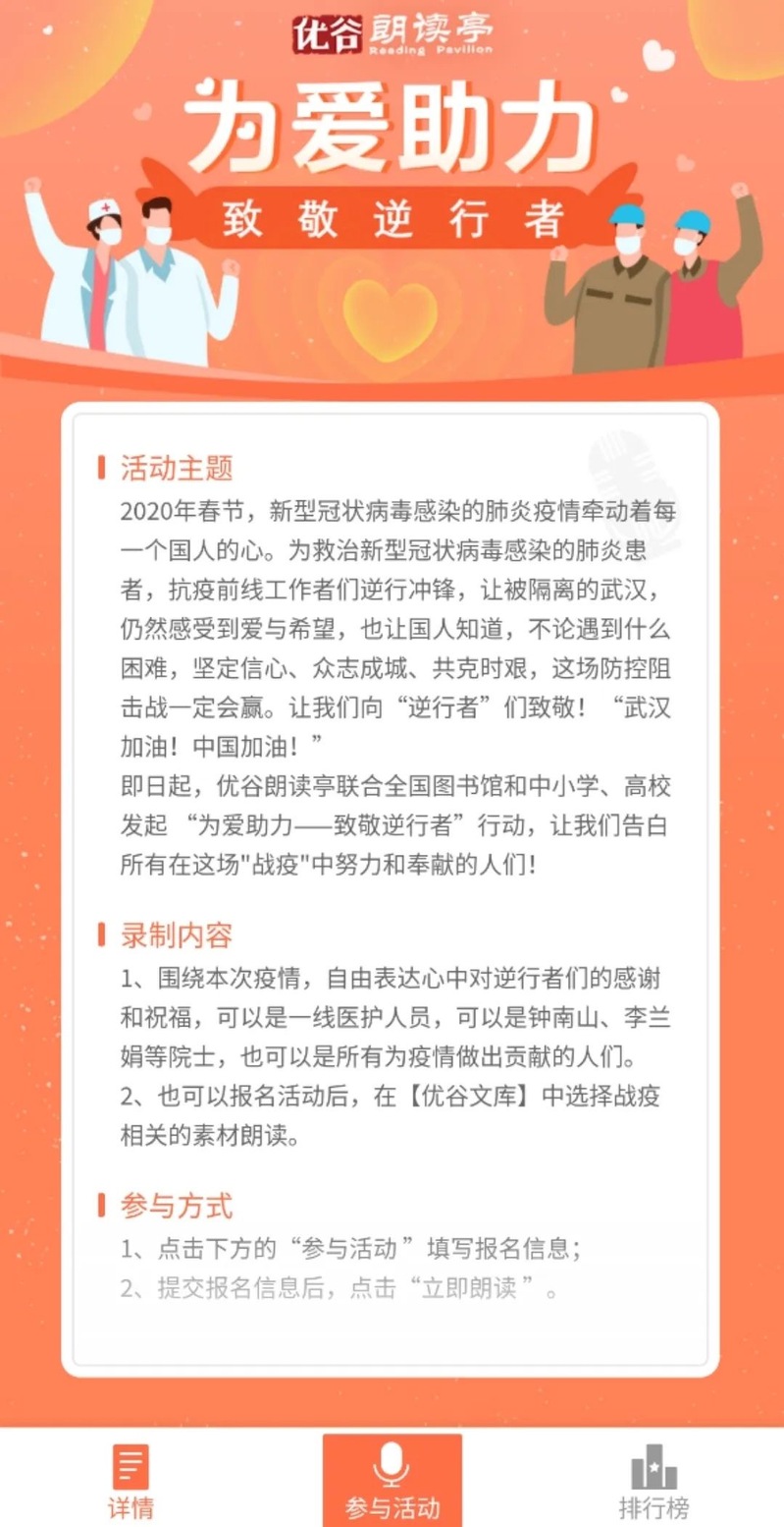 為感謝所有朗讀者,本次活動的優(yōu)秀作品將在【優(yōu)谷朗讀】小程序置頂展播,“圖書館”和“優(yōu)谷朗讀亭”等多所高校、中小學的微信公眾號也將聯(lián)合推送,您的告白將被逆行者們收聽。