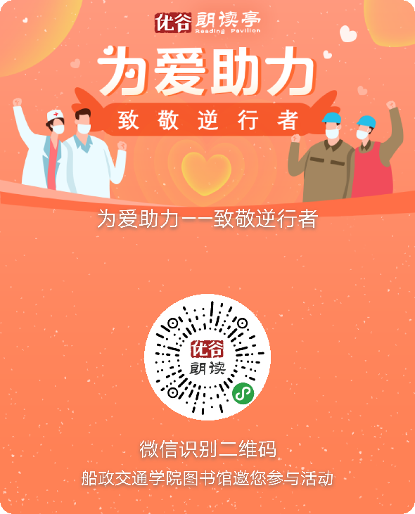 “品書香,蘊傳承,我與船政共成長”圖書館第十屆讀書月系列活動火熱進行中,圖書館與優(yōu)谷朗讀亭聯(lián)合發(fā)起 “為愛助力——致敬逆行者”行動,讓我們告白所有在這場"戰(zhàn)疫"中努力和奉獻的人們!